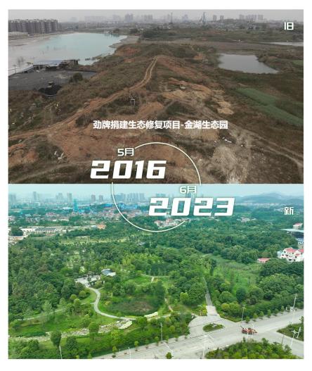 為回報社會,同時響應(yīng)我市當時“生態(tài)立市,產(chǎn)業(yè)強市”的號召,勁牌公司決定捐資對金湖街道石頭咀一帶的采礦區(qū)進行生態(tài)修復(fù),并對周邊鄉(xiāng)村進行美麗鄉(xiāng)村改造,將這里打造成青山碧水、宜業(yè)宜居的家園。在市政府的主導(dǎo)及支持下,歷經(jīng)多年的整治、修復(fù)、升級,終于補齊了生態(tài)欠賬、還原了生態(tài)綠色,變成如今的金湖生態(tài)園。
